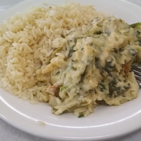 Foi servido: macarrão, almondegas, Risoto de bacalhau e salada.